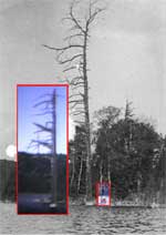 Tamakwans from the 50's and 60's remember a giant, dead cedar tree on the way to camp. It dwarfed Lone Pine and was in many camp movies. It was also the subject of two year-end plaques. Browsing the Algonquin Park archives came up with a picture of it BEFORE Tamakwa was established. It was even bigger than we knew it. This is a comparison of it's size before we saw it, and as we saw it. | |