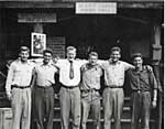 A 1947 Group shot in front of the dining hall shows the origin of the "This Mirror is Clean, Are You?" Shtick. The mirror was only ten inches wide, but the slogan was better. It's at the upper left of the picture. | |